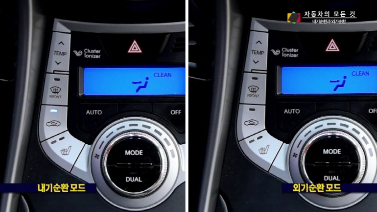 한번 눌러서 불이 들어오면 내기순환모드 , 한번 더 눌러서 불이 꺼지면 외기순환 모드